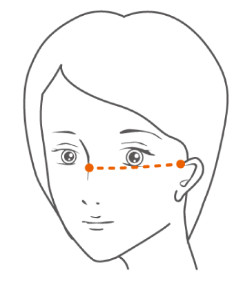 本品の設計上のサイズは『鼻の付け根から耳の上の付け根の直線距離』(イラスト参照)が以下の寸法の通りです。