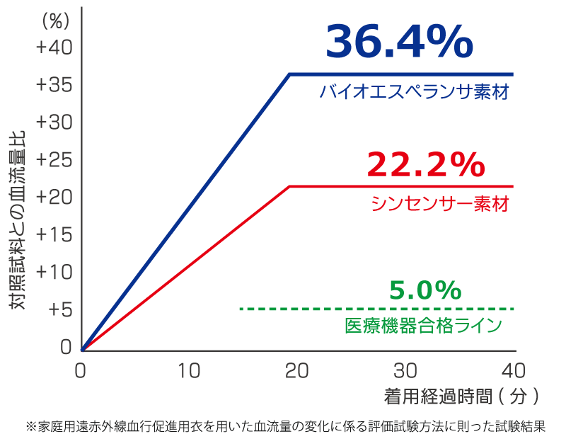 この改正を受け、山本化学工業が開発したのが、「シンセンサー素材」と「バイオエスペランサ素材」です。この2種類の素材を使用したウェア(長袖長パンツ)で、令和4年10 月14 日事務連絡の「家庭用遠赤外線血行促進用衣自主基準」に基づいて臨床試験を実施しました。