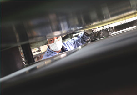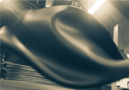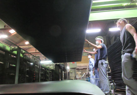 通常、プレス機によって高温にされる熱版は、溶接製熱板を使用していますが、ヤマモトのプレス機は鋳造製熱板です。 そうすることで、高圧で高均一の圧力をかけることができるので、独立発泡率が限りなく100%に近くなります。そして均一に発泡させたことによって、非常に軽量で柔らかい素材として仕上がります。