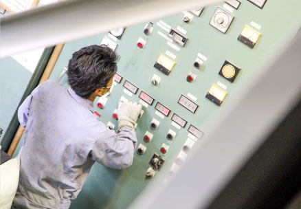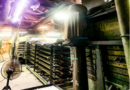 ウェットスーツ素材の原版シートを作る最後の工程は、プレス機を使用して、高温と高圧力によって化学反応を起こして作られます。