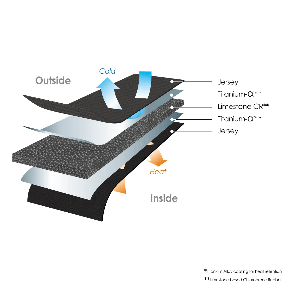 特殊合金を使用した「Ti-Alpha(タイタニューム・アルファ)」を施すことで、内側の体温を反射することで保温し、外側の水の冷たさを反射することで体内に冷温を取り込まないようにする。主にゴム素材とジャージの間の層として加工される。
