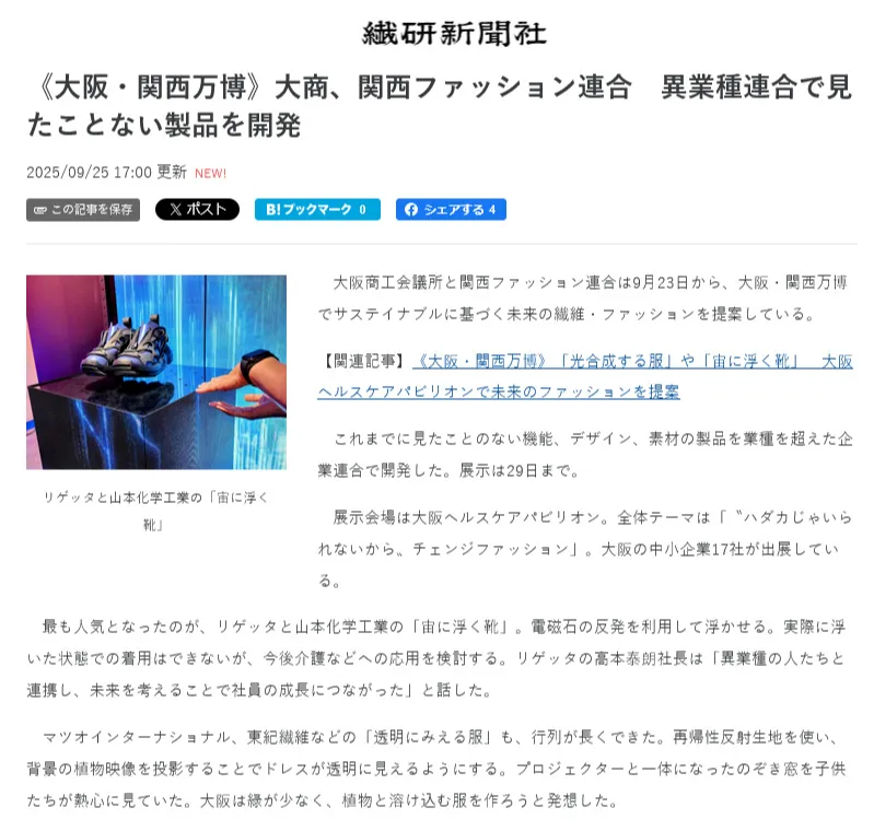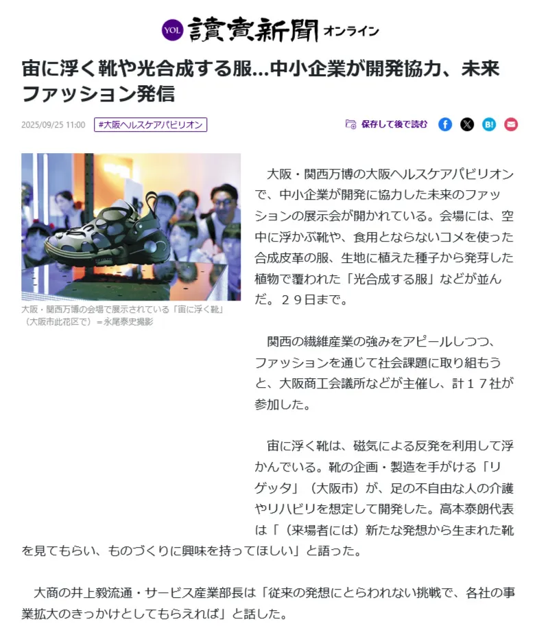 ヤマモトはリゲッタと連携し、“宙に浮く靴”の試作品を大阪商工会議所で公開しました。靴底の磁石と展示台の電磁石で反発させ、靴を浮かせる仕組みで、実用化には課題があるものの、未来の可能性を示す展示として注目されています。