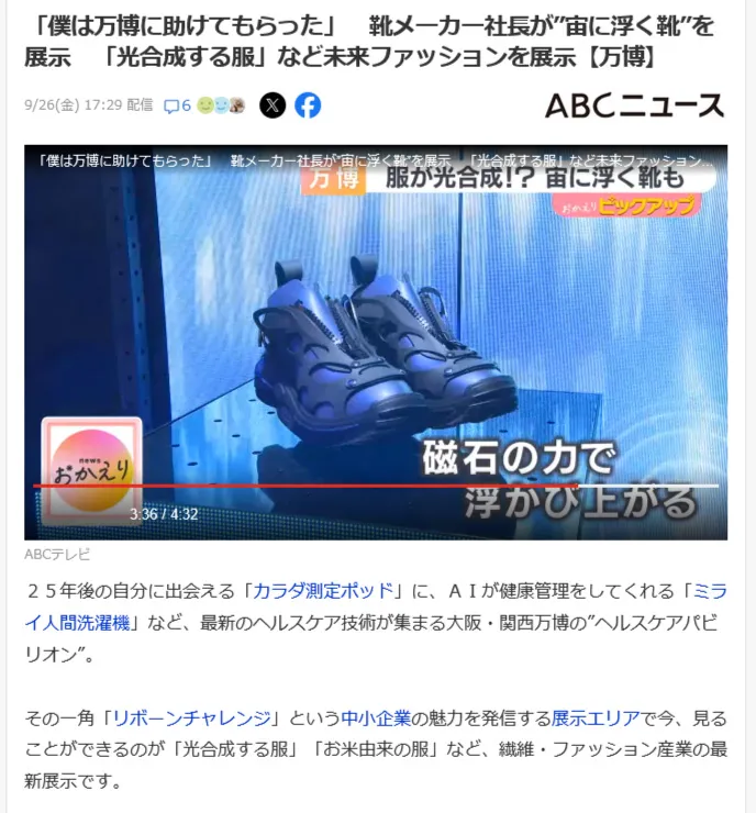 外部サイトへヤマモトは大阪・関西万博における新技術展示の一環として、電磁石の反発力を使って“宙に浮く靴”を発表しました。来場者には技術体験を提供し、将来的な介護分野への応用も視野に検討されているとのことです。