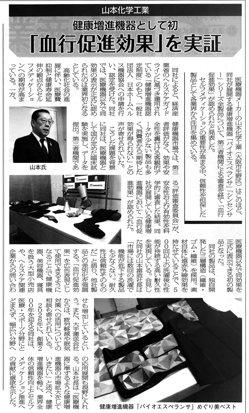 山本化学工業は、健康増進機器「バイオエスペランサ」シリーズについて、第三者機関の評価により血行促進効果が実証されたと発表しました。医療機器以外では初の成果で、独自開発のゴム素材技術が評価されました。今後はヘルスケア分野での活用拡大に期待が高まっています。